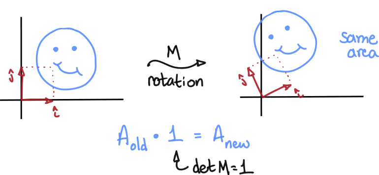 If is a matrix whose corresponding linear transformation is a rotation, then , since rotations preserve area and do not cause mirroring.
