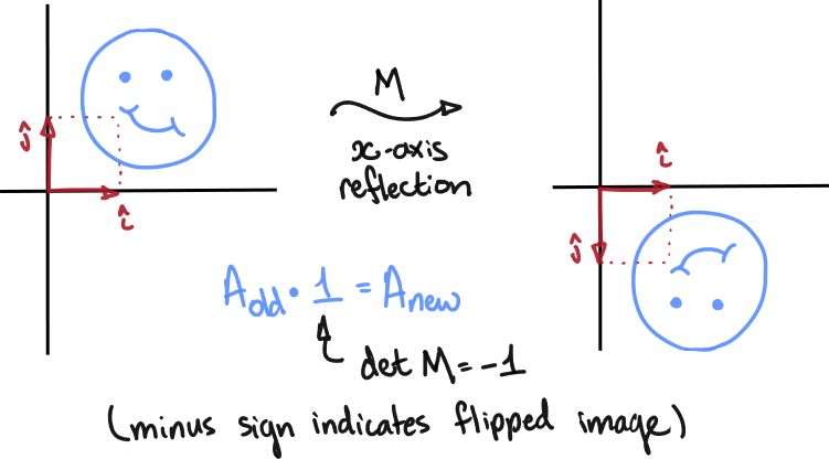If is a matrix whose corresponding linear transformation is a reflection across the -axis, then , since reflections preserve area but do cause mirroring.