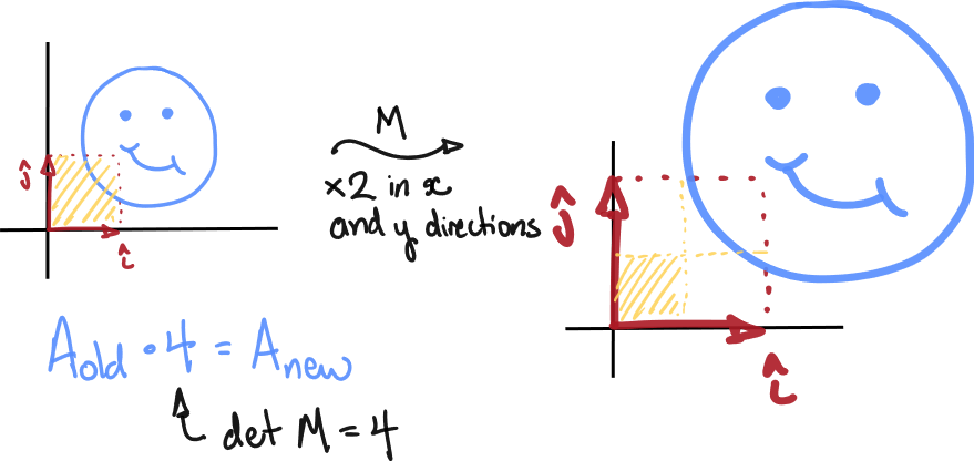 If is a matrix whose corresponding linear transformation causes scaling along the and directions by a factor of , then , since volumes are increased by a factor of but the transformation does not cause mirroring.