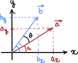 Let and be vectors with angles and defined with respect to the axis in the conventional manner as shown in the diagram below.
