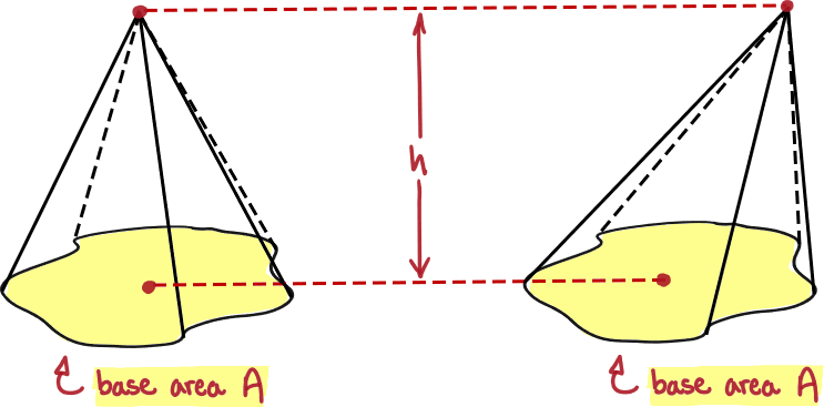 Yes, both of the figures above indeed have the same volume given by the same formula . This initially puzzling fact regarding equal volumes has gained enough notoriety among mathematicians to warrant its own name: Cavalieri’s principle.